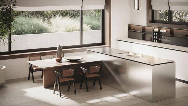 深色系的整体橱柜与不锈钢岛台“强强合作”。
