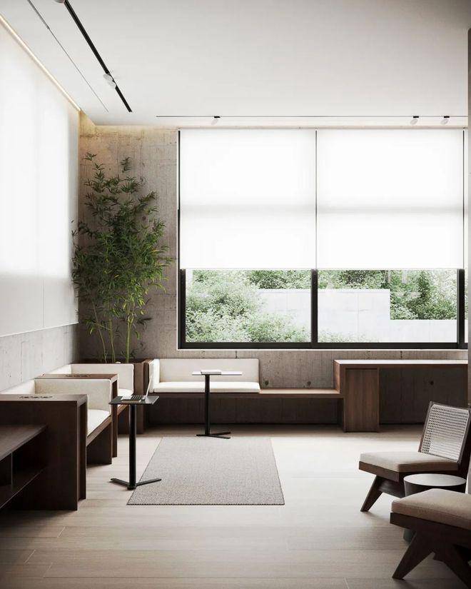 大面积的木格栅装饰了整个空间,落地窗的光线透过格栅,呈现出一种如同皮影戏般的艺术张力,意境缥缈而灵动。