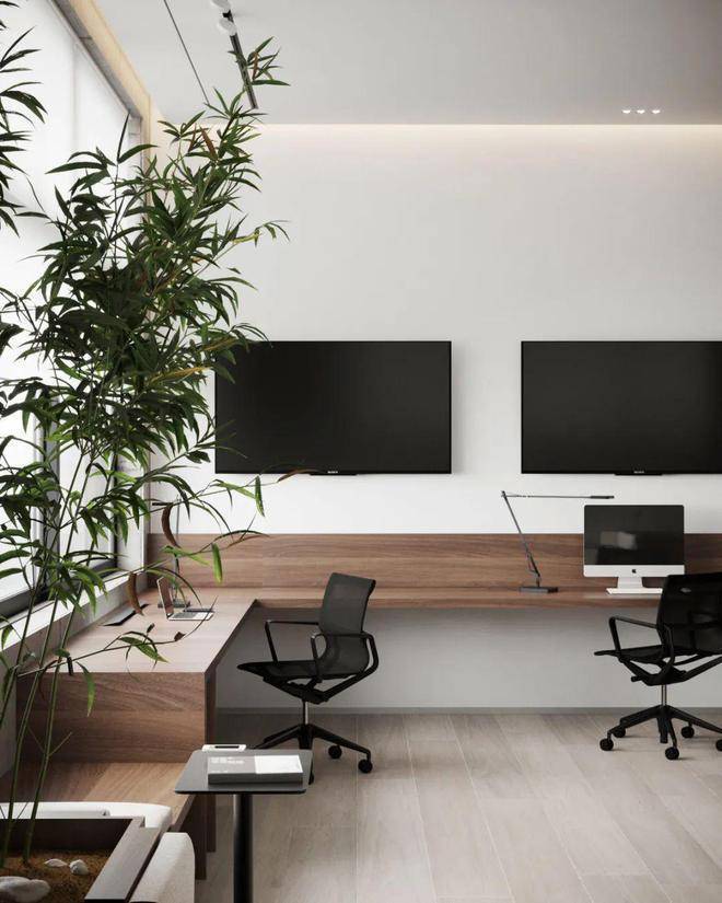 房子里还有第二个家庭多工位的办公区,木质办公桌围绕墙壁一周,将空间很好的利用。