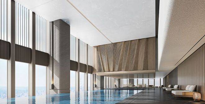 绿地外滩中心还以国际高标准打造了无边泳池,这里也是 外滩最高的无边泳池。在高空中沉浸式享受游泳的乐趣,透过超大的落地窗户,还能欣赏到黄浦江的风光。