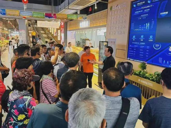 菜场的入口处,一块智慧菜场大屏吸引不少人驻足观看。大屏上,市场日交易额、市场指导价、每日农残检测等数据一目了然。