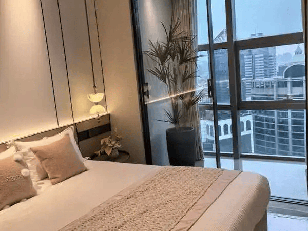 • 全景玻璃落地窗,采光视野拉满;原始层高4.5m,吊顶+地暖铺设后,室内层高仍达3.2m,空间开阔不压抑