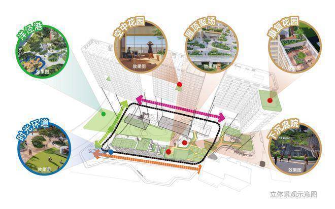 项目打造了仰视、平视、俯视皆有景的4层的垂直景观,做到处处有景,景不相同。长者站在2楼的屋顶聚场上,向西可以看到的社区花园外就是洋泾港市政公园和洋泾港水系,站在9楼的空中花园,向下看,空中连廊、社区花园、下沉庭院尽收眼底。通过电梯,实现“一键式”景观切换,垂直花园的魅力就在于此。