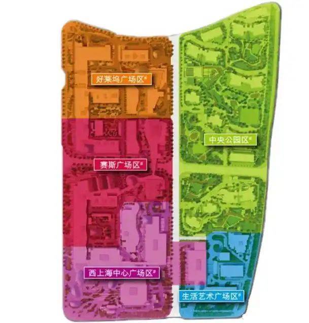 整个高尚领域划分成五大多元化生活主题:以住宅为主的中央公园生活区、提供娱乐设施的好莱坞广场区、设特色餐饮的赛斯广场区、设甲级商厦和星级酒店的西上海中心广场区,及适宜摆放现代艺术品的生活艺术广场区。