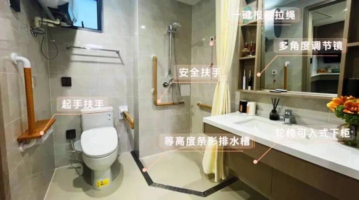定制化适老家具:白蜡木防撞圆角餐桌、助力扶手卫浴等,让长者无忧安全拎包入住。