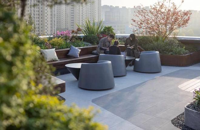 拾阶而上,来到“悦·空间”的主题露台。通过悦食、悦闲、悦趣、悦享、悦厅五个大小、功能各不相同的主题空间,不仅是商务交流的平台,更是企业休闲的乐园,在这里,人们可以举办会议茶歇,品尝户外烧烤美食,观赏露台上的电影,展开人际交流与合作。屋顶空中花园与首层私属花园相互呼应,共同构建起立体生态健康办公的模式。在这里工作的人们不仅能够享受到自然带来的舒适与愉悦,更能够将工作与生活完美融合,创造出富有活力和创造力的工作环境。