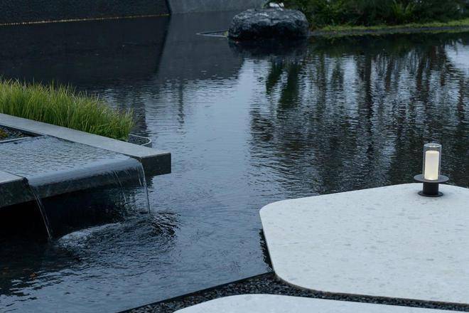 洽谈区掩映在绣球花径与娜塔栎的树影婆娑之中,水系环绕,背靠浓密的植物背景,打造静谧的户外会客空间,将人们带入一个诗意与雅致并存的境地。悬浮于水面的苔藓案台,从远处的水景一直延伸到会客区中央,与潺潺涌泉、天然置石、雅致植物相结合,如精致盆景一般的微观山水,展现山水美学的精髓和品味。一抹浮苔,将会客区的视线引向远处的景观,营造疏朗惬意相互渗透的空间。