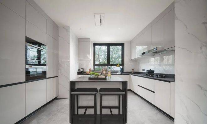 厨房玻璃门是上轨道移门,意味着地面部分没有任何轨道,不会有灰尘积攒,炒菜时关上,避免油烟散入室内;平时拉开,可以扩充室内视觉感受。