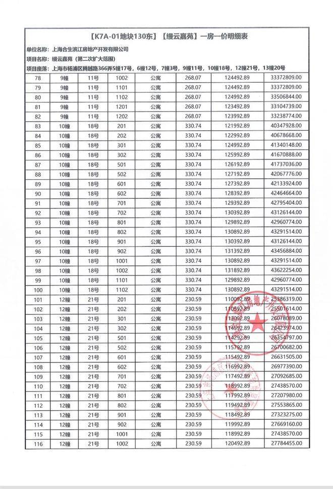 一房一价表如下