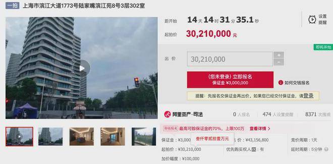 2022年10月,在阿里拍卖网站上,陆家嘴滨江挂牌了2套“高价房”,一套来自九庐,起拍价3021万元,折合约12.17万/㎡。另外一套位于万科翡翠滨江,起拍价1.1亿元,顶楼复式+地下车位,折合约17.87万/㎡,这其中还不包括各种税费。