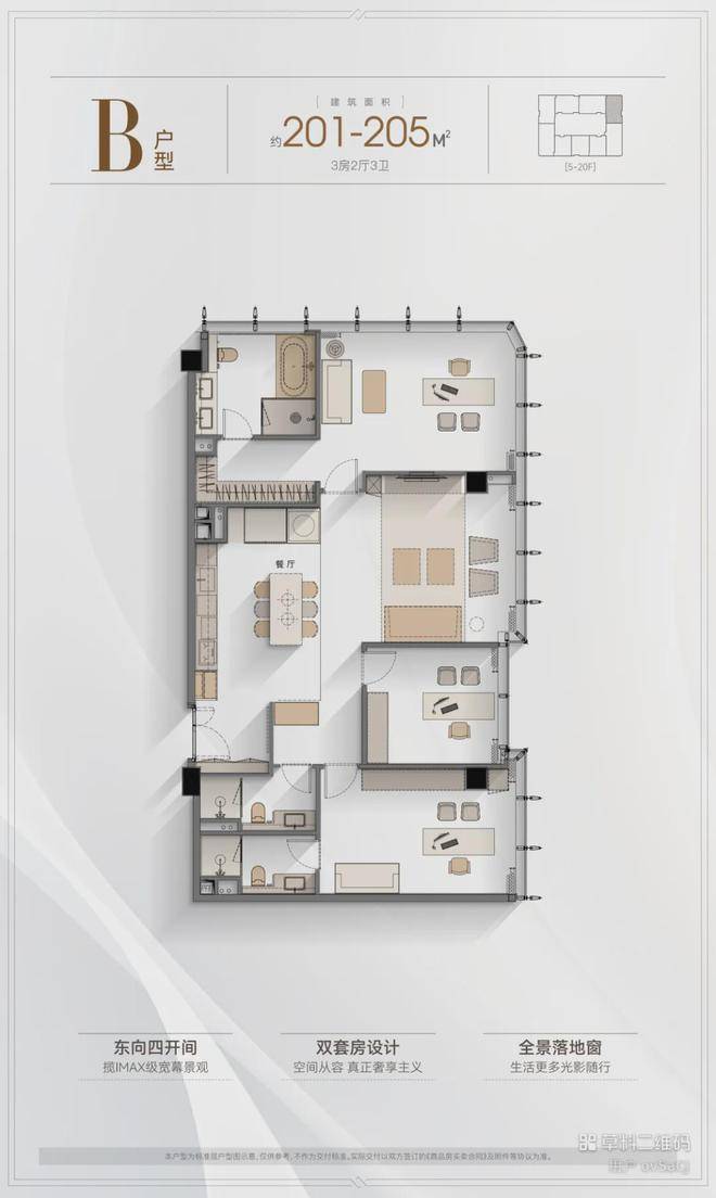 项目东地块分四期开发,一期花园独栋办公,共19栋;二期为一栋5A甲级写字楼、minimall;三期为西塔公寓、商业block街区,5栋小独栋办公;四期为758套租赁式公寓。