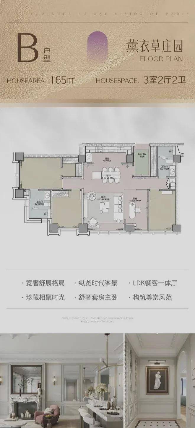装修标准:法式精装交付(含中央空调、地暖、新风系统),外立面采用干挂石材。