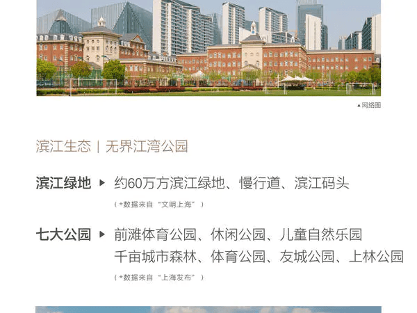 滨江绿地/公园:约60万方滨江绿地,慢行道,滨江码头,前滩体育公园,休闲公园,儿童自然乐园,千亩城市森林,体育公园,友城公园,上林公园等。