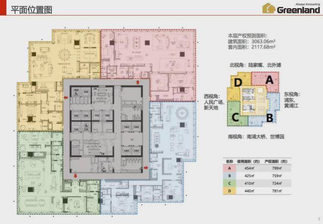 【绿地外滩中心】T1超高层国际甲级办公,集商业、酒店及办公于一体,总高度约300米(62F),其中商业总建筑面积约4.2万方,办公总建筑面积约10.75万方,大堂净高约17.5米,标准层高约4.5米,单层面积区间约2000-3000+㎡,主力户型面积约724-799㎡。