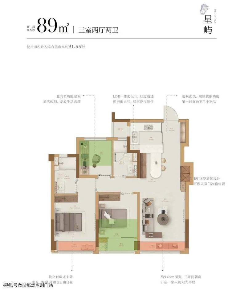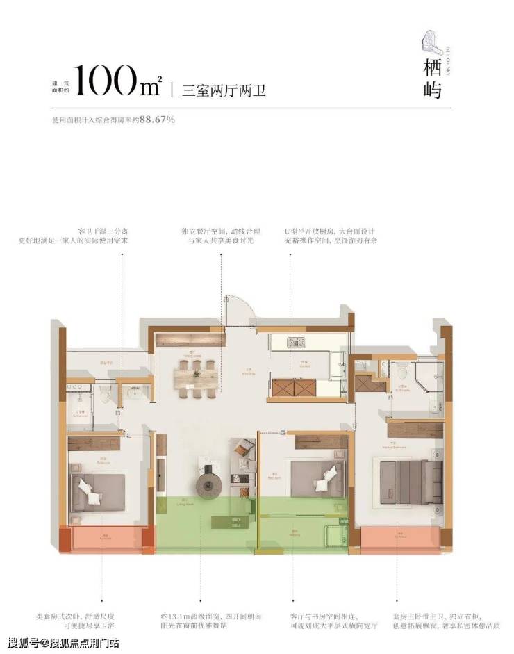 大量赠送面积的拓展,使其拥有约97.44%的超高得房率,堪比市场面主流约150㎡+户型的实用空间。