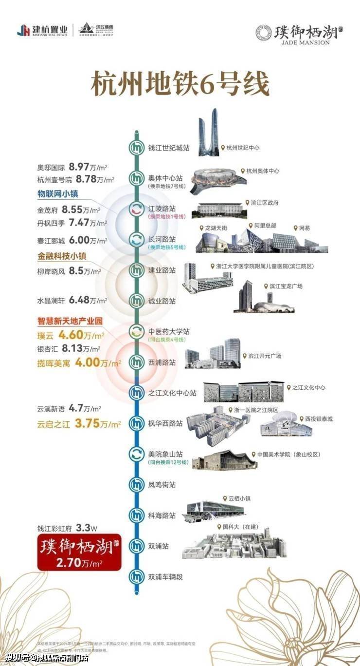 地铁6号线双浦站与项目直线距离约500米,从双浦站出发,4站之江文化中心,6站滨江区,高效往来奥体博览城、钱江新城。串联宝龙城、滨江天街、星耀城、IFC(在建)等商业金线;速达浦沿智慧新天地,脉连华为全球培训中心、阿里巴巴、吉利、海康威视等产业金线……触达未来无尽可能。