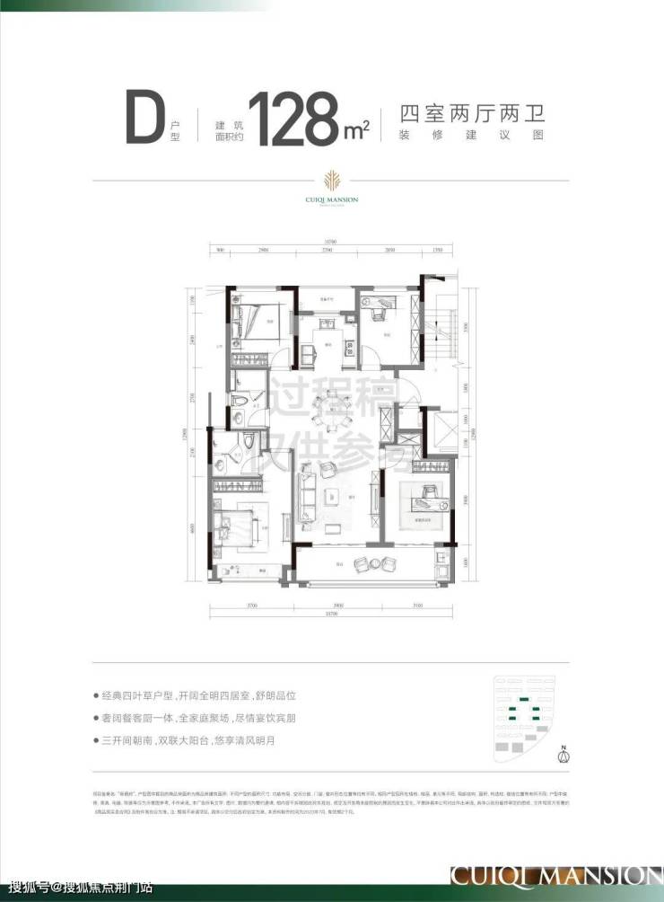 建面约128方采用了深受市场认可的经典的四叶草格局!这种户型的显著特点,就是消灭过道。客厅居于房子的中心,可以直接到达卧室、书房、厨房等各个空间。另外,4个功能间居于四角,对私密性的维护也和当下社会注重隐私的需求不谋而合,即使是孩子、长辈同住,也能有一个很好的家庭秩序。