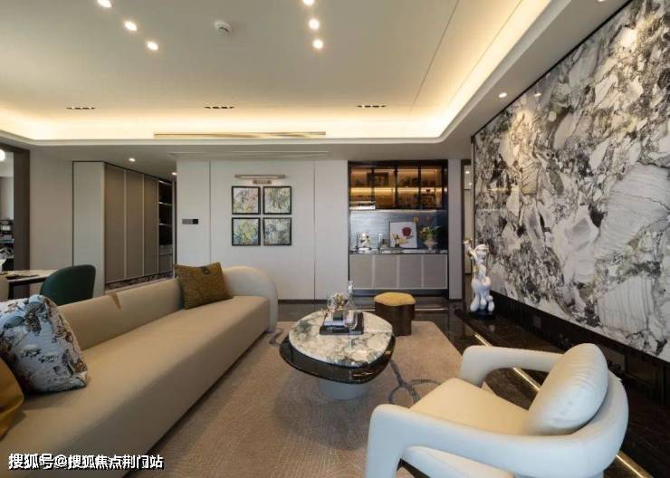最后,是它藏在细节里的“美商”。全屋无主灯设计+弧形吊顶,客厅和主卧做了“双背景墙”。玄关柜、主卧衣柜全是交标,用上了编织纹皮革+冷翡翠岩板