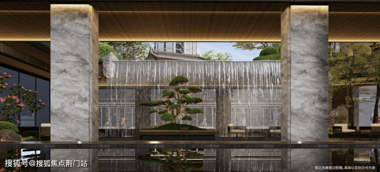 南北两侧,分立两座约46米宽、8米高(宽度含两侧景墙)的禅境中式大门,威仪棣棣气度不凡。此为第一进“登门望府”,光仪式感就傲视群侪。