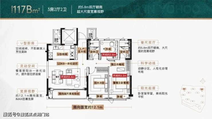 譬如,建面约115方三房两厅两卫,以三开间朝南搭配LDKB一体化阔厅,通过约27方餐客厅与观景阳台无缝串联,尺度彰显气势之外,与公区融合后,衍生出更多社交价值。