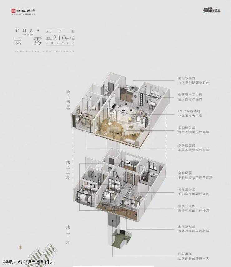 以建面约210㎡的上叠“云雾”和建面约221㎡的下叠“旗枪”为例。月陇云岚解决了很多叠院上下叠共用电梯这个痛点,在这个项目里,所有的户型都是私梯入户的。下叠入户口在南向花园,上叠在一楼也有北向私梯入户花园空间。