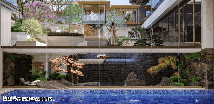 雲润宸庐从这幅古画中汲取灵感,打造了近9米高差的下沉庭院。瀑布从石壁倾泻而下,雾气氤氲、树影摇曳……仿佛不是走在下沉式会所庭院,而是步入了一幅立体山水画。