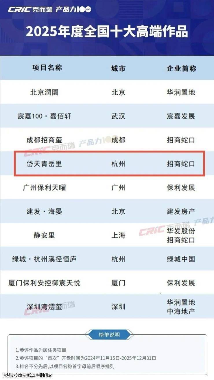 克而瑞《2025年度全国十大高端作品》榜单正式发布,招商蛇口·天青岳赫然登榜,与上海静安里、深圳湾澐玺并列成为全国高端人居典范。