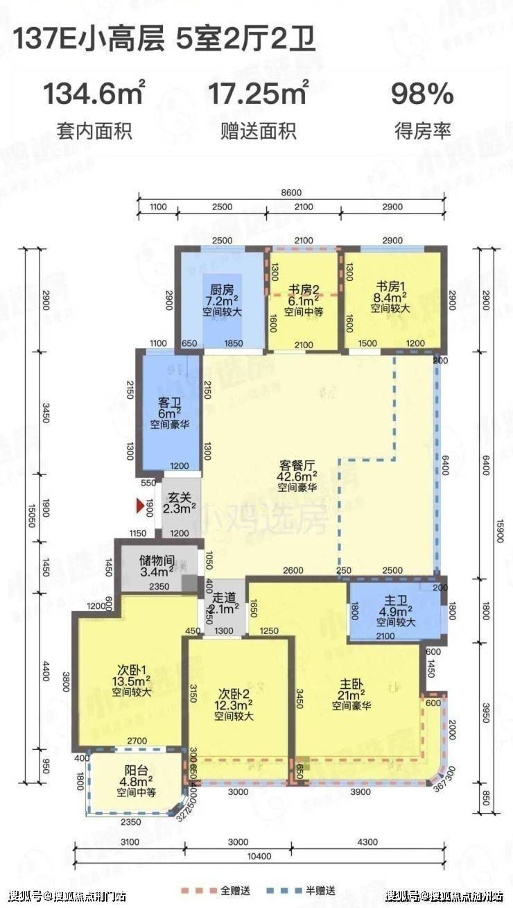 亮点:得益于新规,得房率约98%,实现五房布局,功能性强。