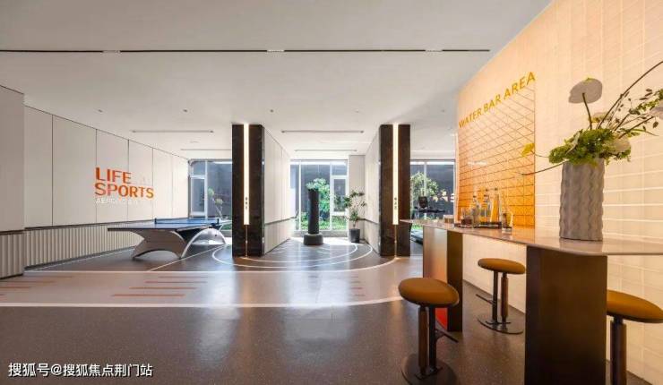 水系旁还有一个下沉式的景观廊架,围合布局的沙发预示着这里未来会是“聚会趴”的核心,与岛台后方的高脚座椅一起容纳所有的流光溢彩。