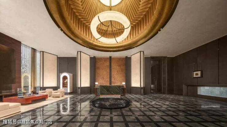 穹顶承袭皇家宫殿藻井形制,采用非遗“泥金彩漆”工艺,手工逐寸贴金,金辉流转,如星河垂落。中央圆环吊灯取意“礼玉”,寓意天圆地方,敬天礼地之思,凝练于此。