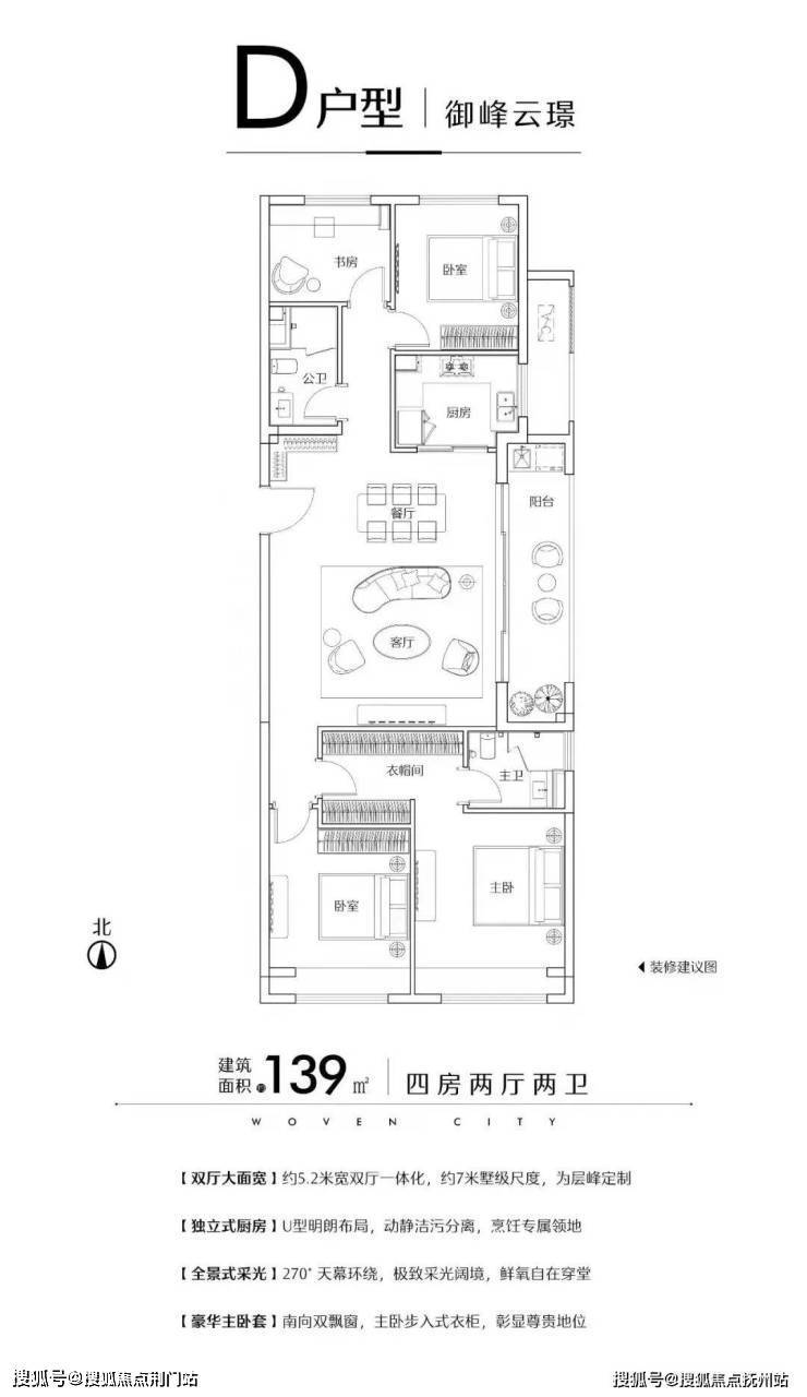 以建筑面积约139㎡为例:“四叶草”设计,让四个卧室格局独立,每位家庭成员都可以享受到无比舒适的起居尺度和私密生活;客餐厅一体化设计,集合了欢聚时光与亲密关系,营造出开放的互动场景;与宽厅自由接洽的跑道式阳台,更打破了空间界限,迎纳风景与阳光入室。