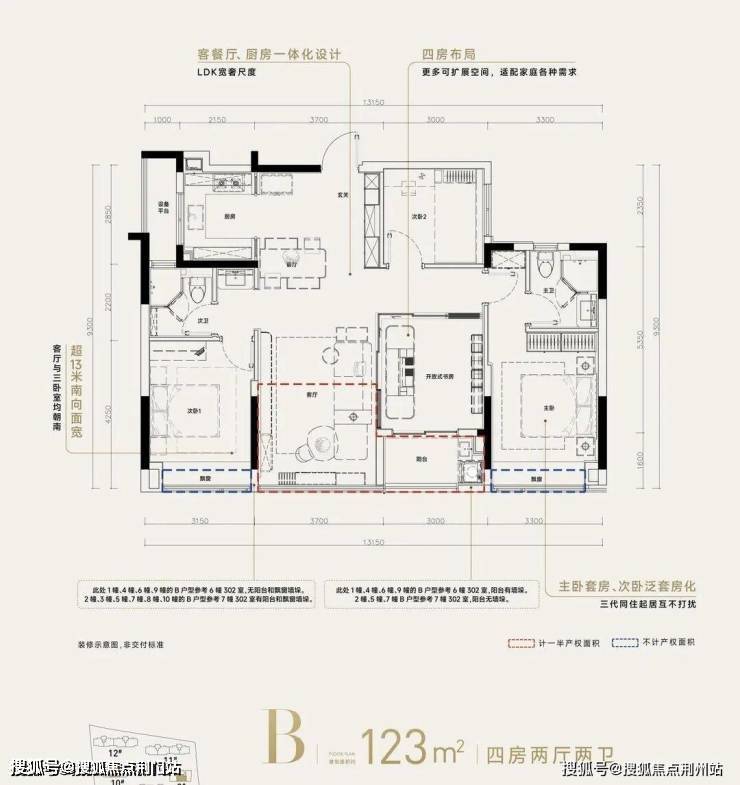 ❸高层建筑面积约123㎡户型,4房2厅2卫,含赠送得房率约90%。