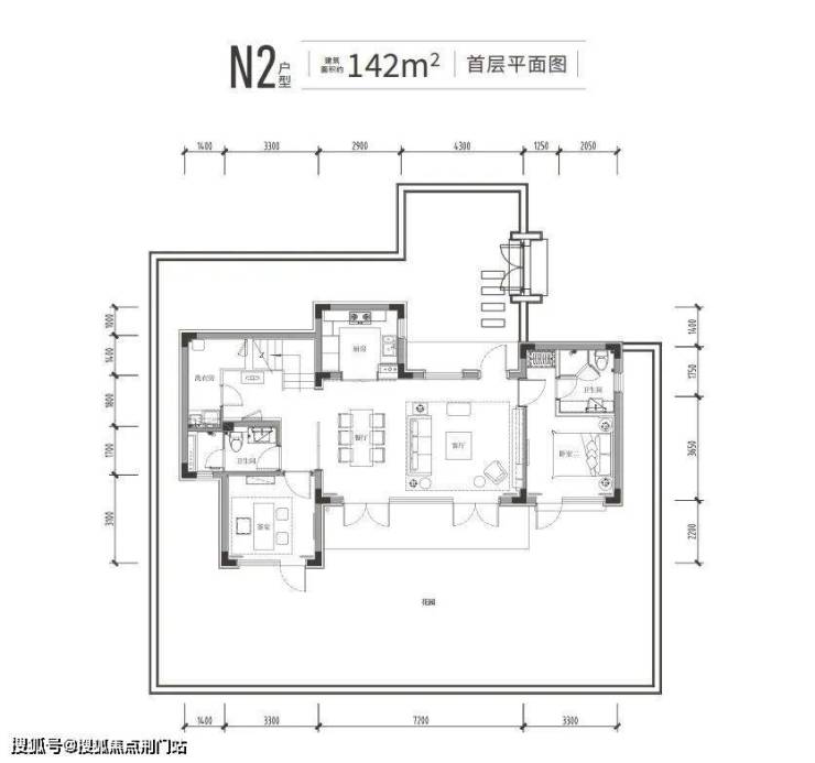 以约142㎡户型为例, 面宽约15.2米,标准4房4卫。一楼是约7.2米长的双面采光大横厅,除了老人套房,还有个向院子伸出的“X空间”。它既能用作茶室、棋牌房,也能成为私密的客卧。