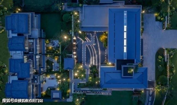除了成片成片的品蓝色陶瓦+金属包边檐瓦,主入口形似波浪的直棂窗、会所的一长排立面屏扇,还借鉴了更高贵的秘色瓷(带绿的蓝色)。加上大片的灰蓝色玻璃,形成“蓝”之底色。