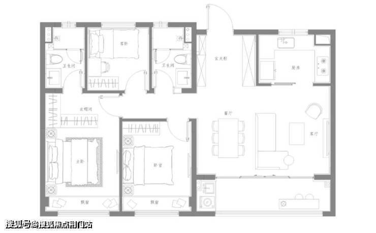 最终,它居然实现了 比130+㎡户型“只少一个房间”:不仅餐客公区完全不输,还“抠”出了带L型衣帽区的主卧套房、U型厨房,以及带双排入户柜的大玄关,简直让收纳控们尖叫。