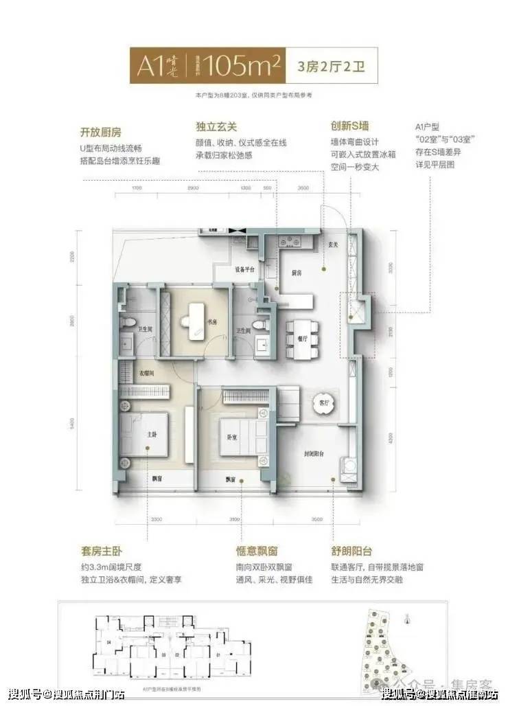 建面约105㎡晴光户型,不仅实现更优面积排布,更做到精神与审美的高度适配。在设计中,这间三房同样拥有南向大面宽, 搭配S墙/开放式厨房/一体化餐客厅/多功能书房/酒店套房主卧等,将整个空间的开阔感和互动性做到极致,满足居住者对舒适、安逸的“精准需求”。