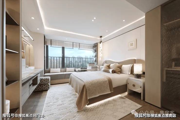 在春来晴翠园 建面约169㎡晴翠户型中,最亮眼的设计显而易见—— 主卧90°转角窗,揽获270°环幕视野,将天光云影尽纳室内。不仅引入绝佳采光与风景,更成为一处心灵栖所。