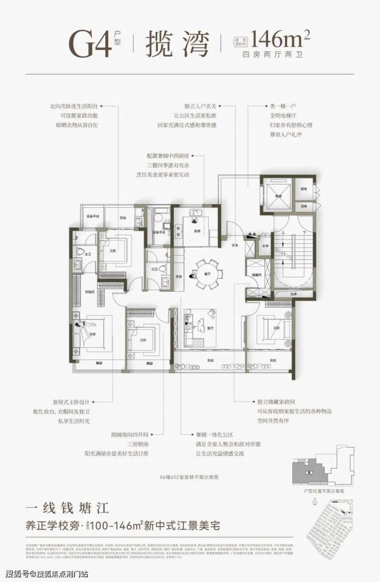 建面约146㎡户型分为“横板”和“竖版”,“横版”是四开间朝南+大方厅,“竖版”有大边厅+超长转角飘窗的“全景舱主卧”。