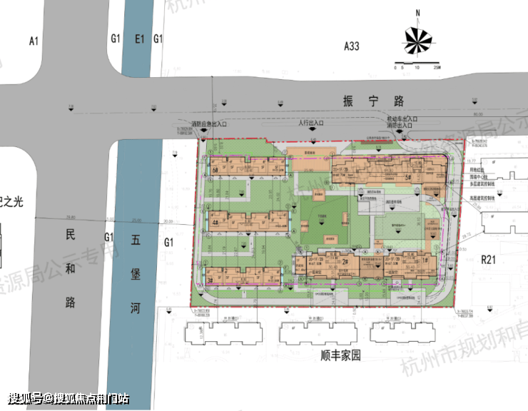 主要出入口位于北面的振宁路上,西面有五堡河一线河道景观。