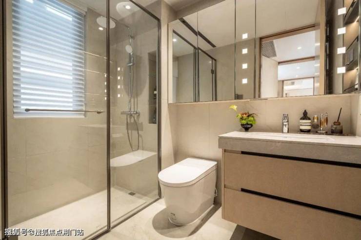 卫生间镜柜内嵌插座,一次性解决吹风机、卷发棒等长期“连线”需求。柜门后设有隐形层架,实现 “用品视野化”。每户主卧还标配美妆冰箱,精华、面膜、眼霜与食材彻底分离。