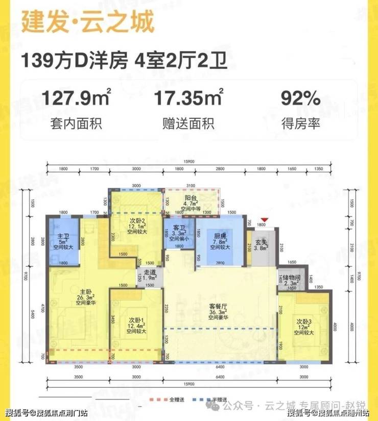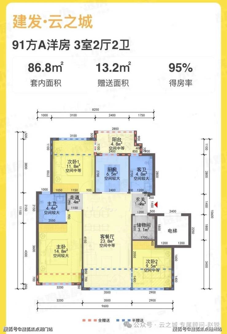 云之城做了封闭阳台,得房率最高能达到96%。T2分布户型,放眼整个市场,这样的得房率绝对是名列前茅