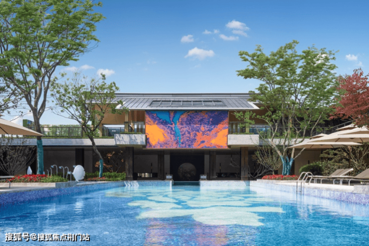 穿过大堂,眼前就是约380方的下沉式露天戏水池,分别设置标准戏水池、儿童浅水池、按摩池。沿岸设置水吧、卡座、树岛,设计融合新中式的瓦当流水,对标奢派度假酒店。