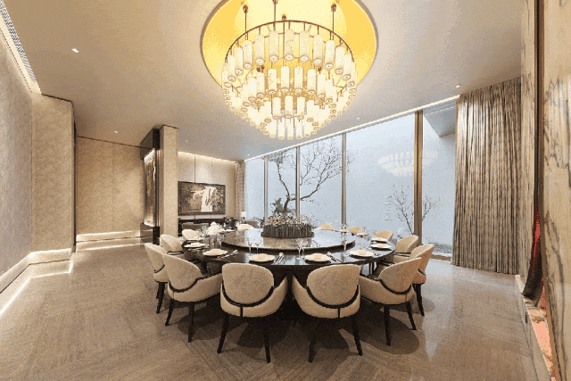 穿门而入, 巨大的圆形藻井天幕,令人叹为观止。中庭一株近 百年桂花+环形门庭组成了向内的“聚宝盆”,归家的仪式感直接拉满。