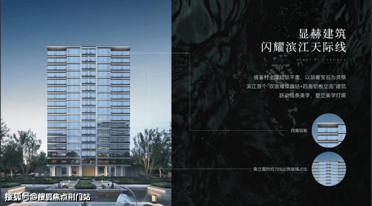 滨江首个“双面璀璨晶钻+四面铝板立面”建筑,南立面玻璃占比超70%,全楼玻璃占比42%,远超越市场上同类产品(30-35%)至少10%以上,甚至高于普通写字楼玻璃幕墙。让建筑的南北立面‘双面闪耀’。