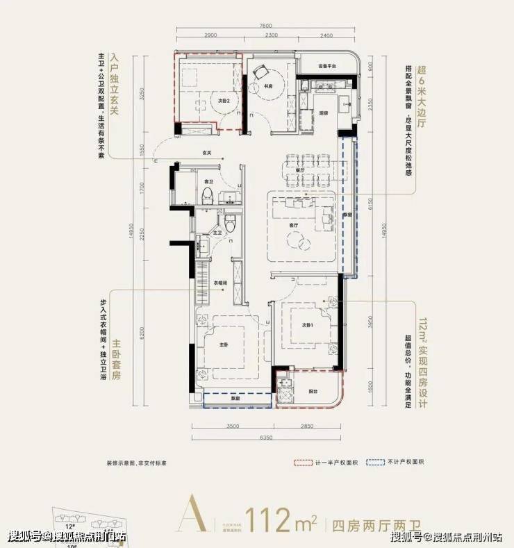 ❹高层建筑面积约112㎡户型,4房2厅2卫,含赠送得房率约92%。