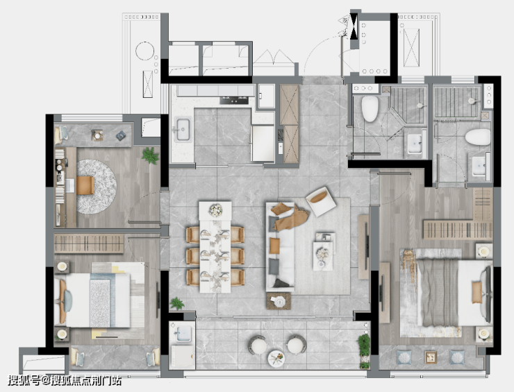 LDBK一体化的公区,充分实现了家庭成员间的互动;除了边厅外接的阳台外,南向次卧同样设计了阳台,兼顾了景观和晾晒的需求。