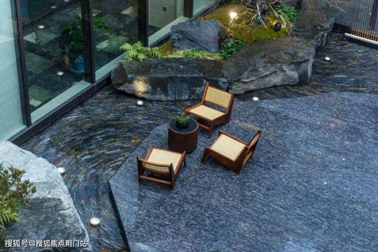 主动退让了十多米的门楼,拉开几十米的恢弘尺度,流水、叠石、罗汉松,加上太行山的60吨自然老石皮背景墙,组成重檐深院下的豪门气场。