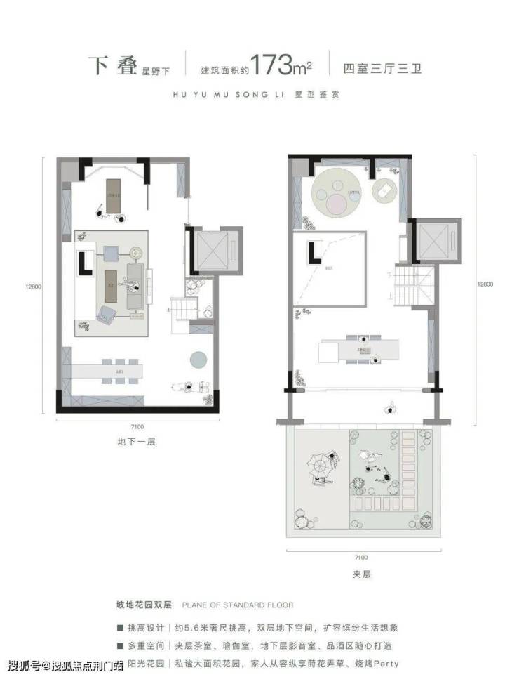 因为特殊的坡地处理,所以有天然的地理高差,地下层与一层自然贯通,形成两个首层,使原有“地下层”跃然平面之上,成为稀有的“阳光院落层”。