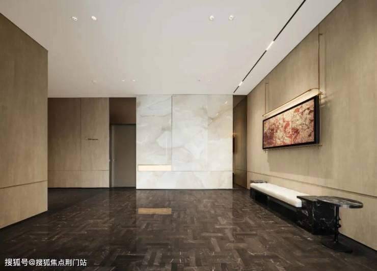 光是从艺术门厅到家门口这一路,就能邂逅高奢岩板、双色拼花地板、不锈钢蚀刻工艺打造的电梯门和曲线吊顶,连入户门牌都采用了“白雪公主”透光云石的做装饰。