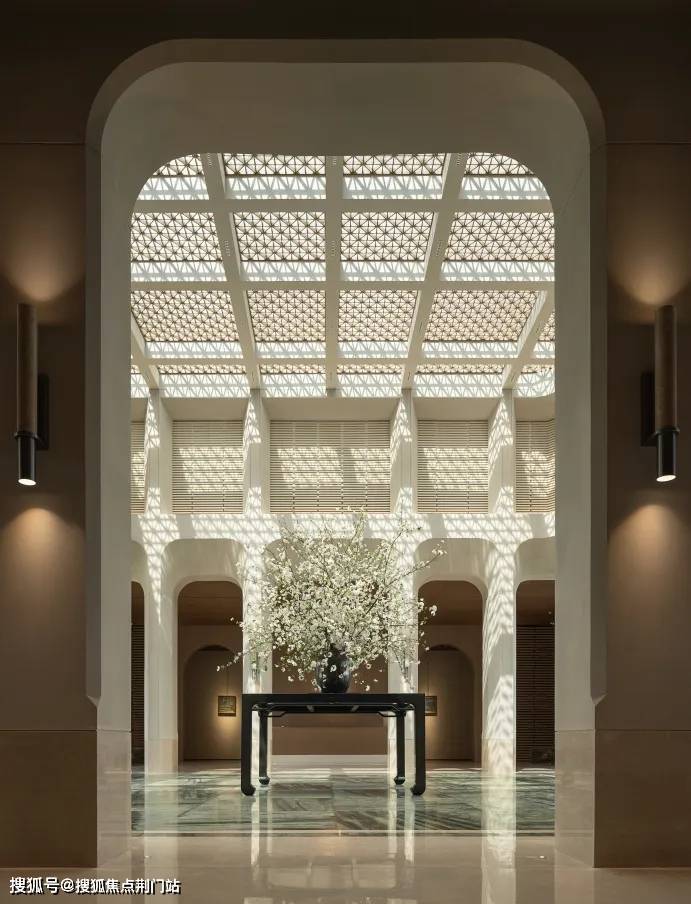 弧线优雅、对称的廊柱拱门,参考卢浮宫玻璃金字塔的穹顶,屏风似的格栅,亚马逊绿奢石拼接地板,就连花艺桌都是大师手作的孤品。